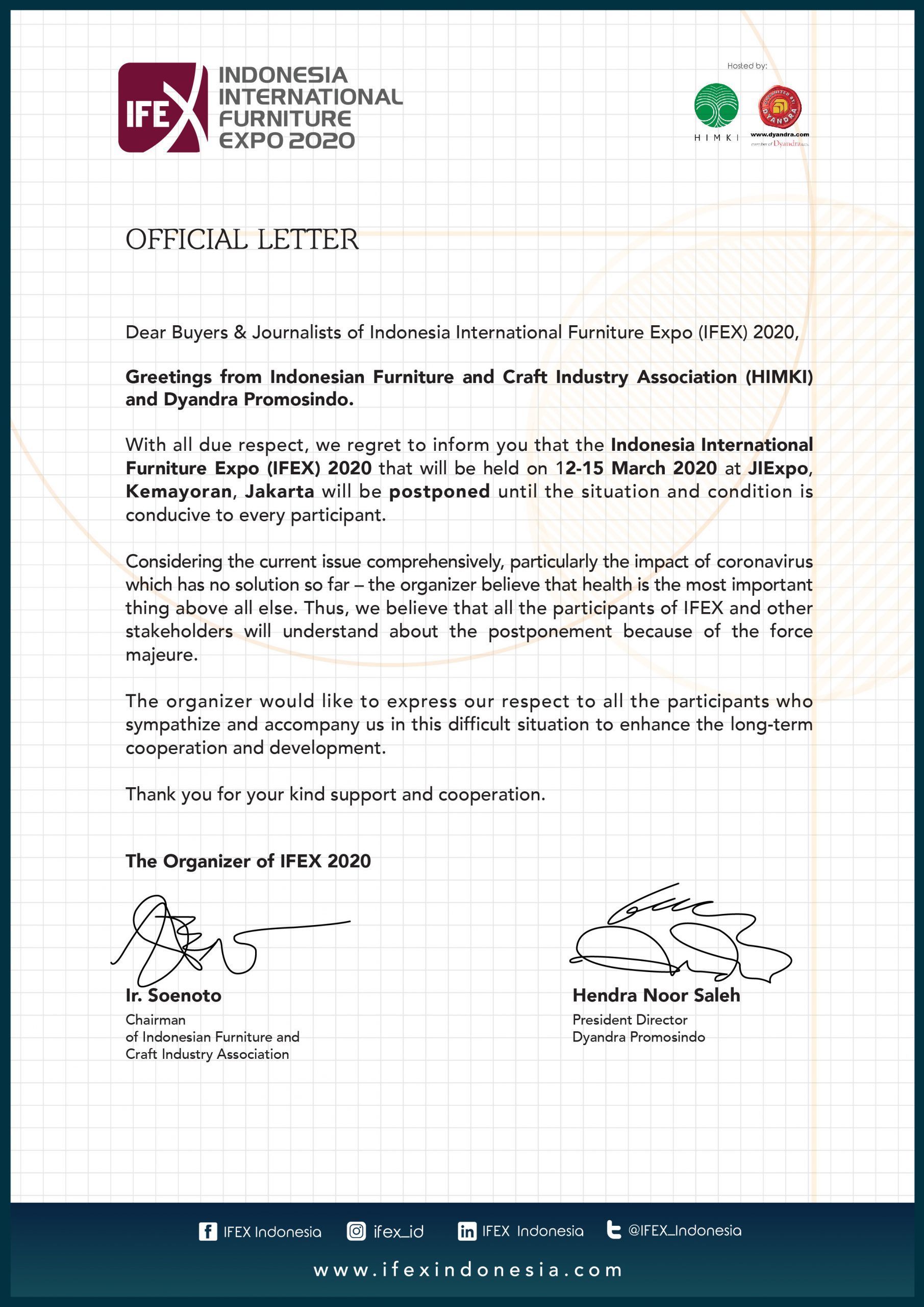 Jakarta, 26 Februari 2020 – Himpunan Industri Mebel dan Kerajinan Indonesia (HIMKI) dan Dyandra Promosindo selaku penyelenggara Indonesia International Furniture Expo (IFEX) 2020 mengumumkan bahwa penyelenggaraan IFEX 2020 yang sedianya akan dilaksanakan pada bulan Maret 2020 mendatang, ditunda hingga situasi kondusif. Penundaan ini didasarkan karena perkembangan situasi mengenai COVID-19 yang tengah mewabah ke seluruh dunia, sehingga atas dasar keamanan, keselamatan, dan kesehatan pelaksanaan IFEX 2020 ditunda karena force majeur.